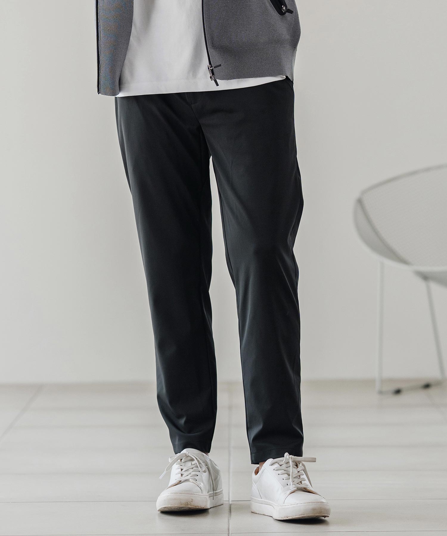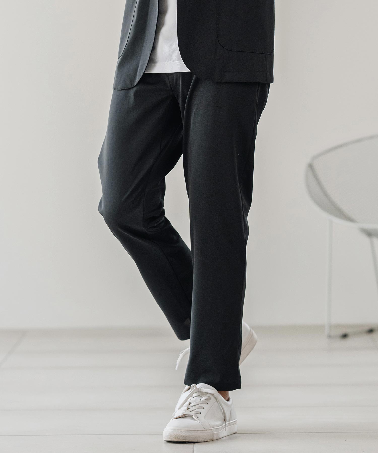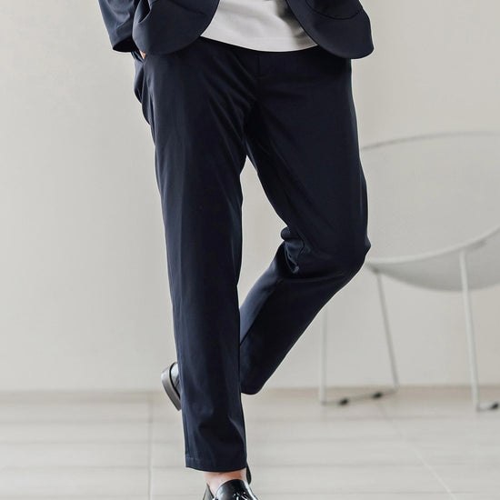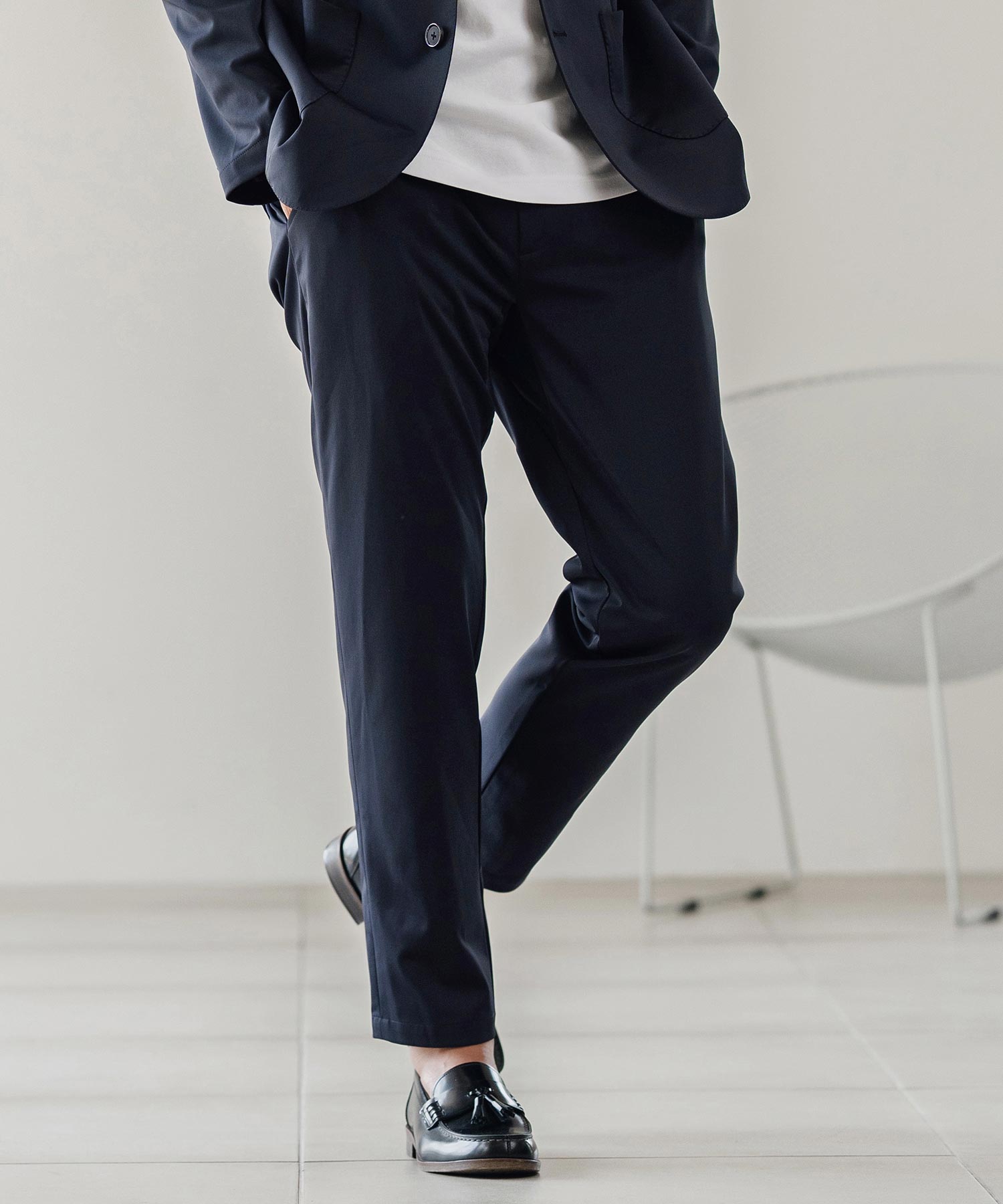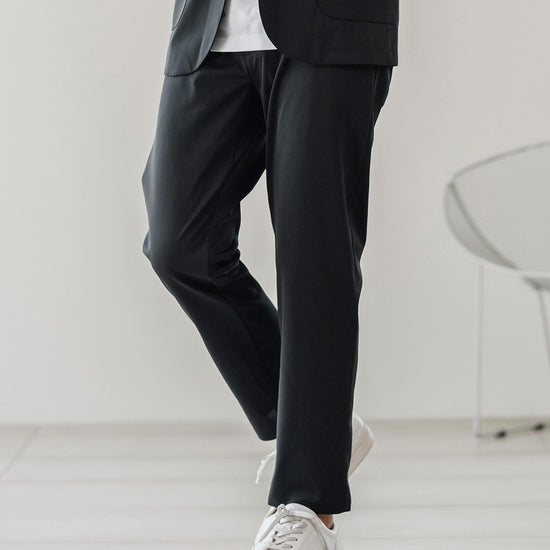 伸縮性のある生地が移動や長時間の着席を快適にし、日常から出張まで幅広く対応可能です。