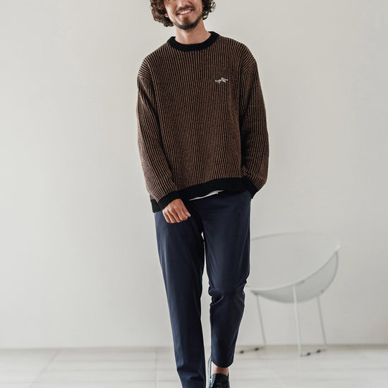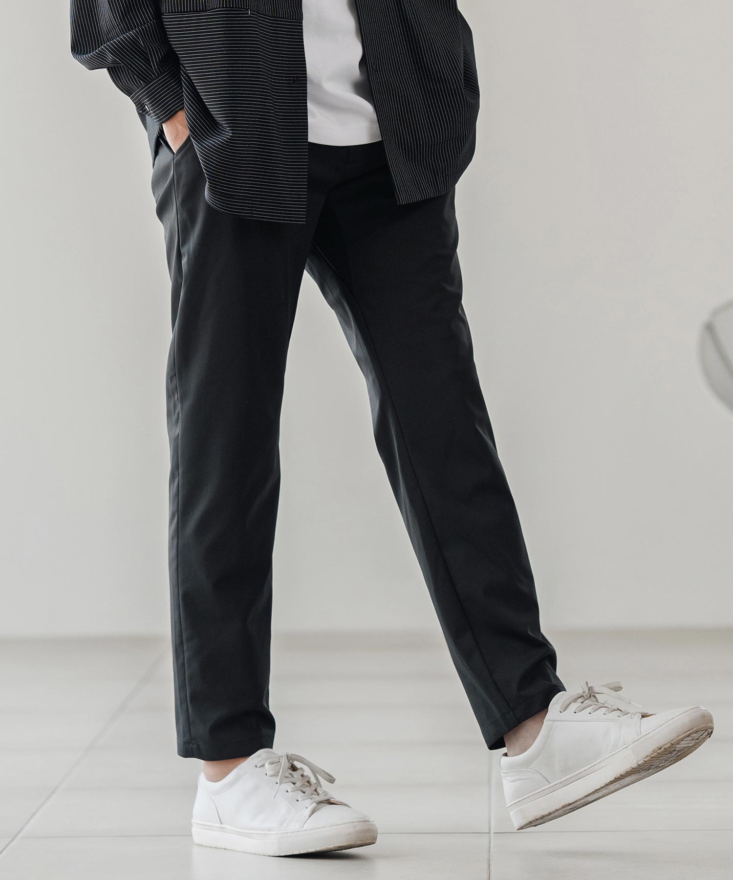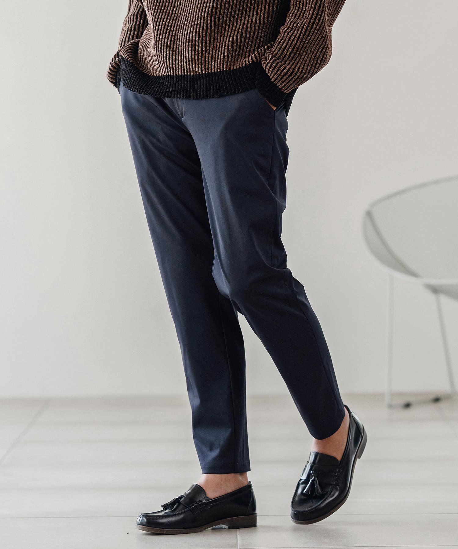 脚に沿って自然に細くなるテーパードシルエット。