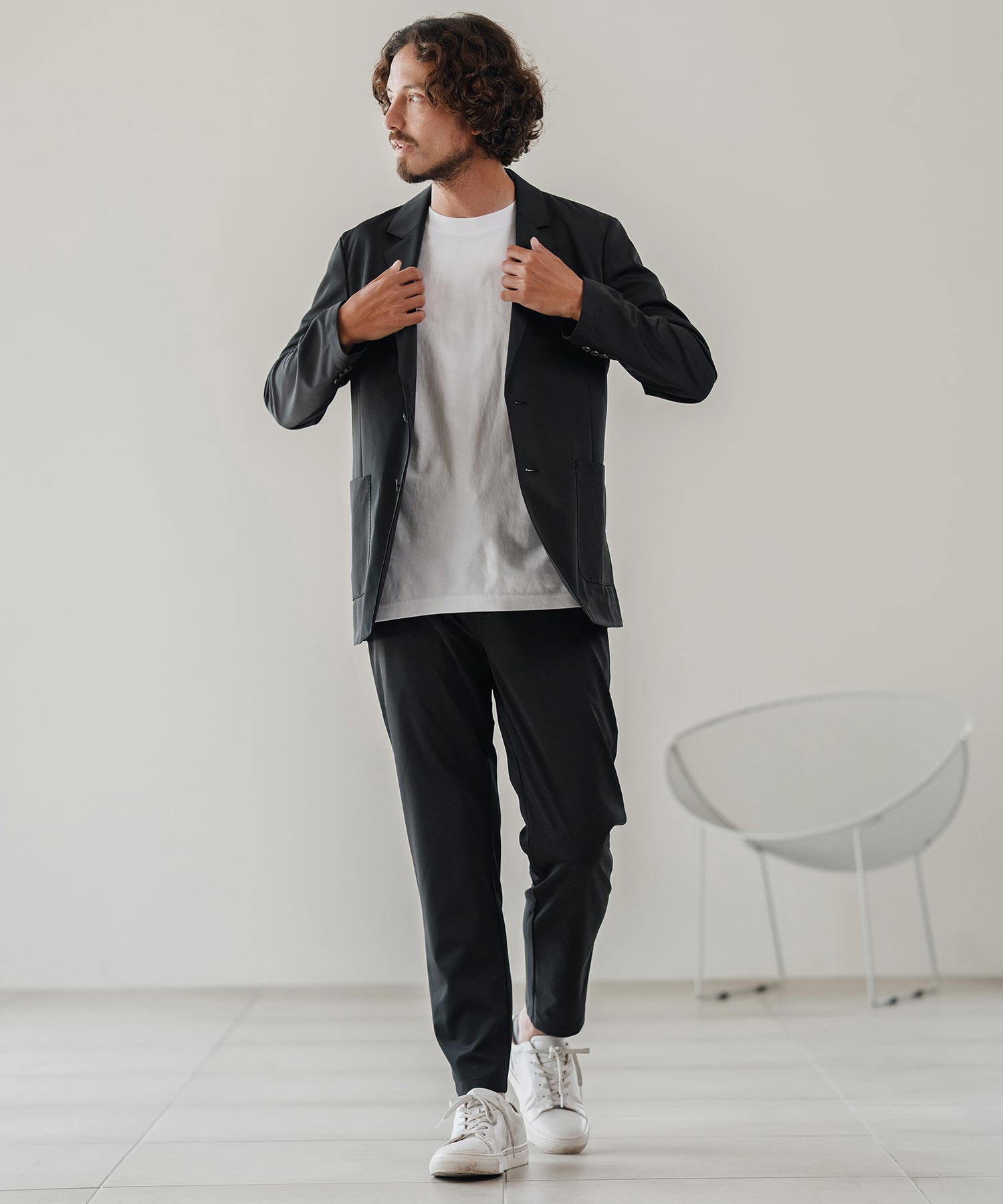 同素材のテーラードジャケットと合わせれば、整った印象のセットアップに。