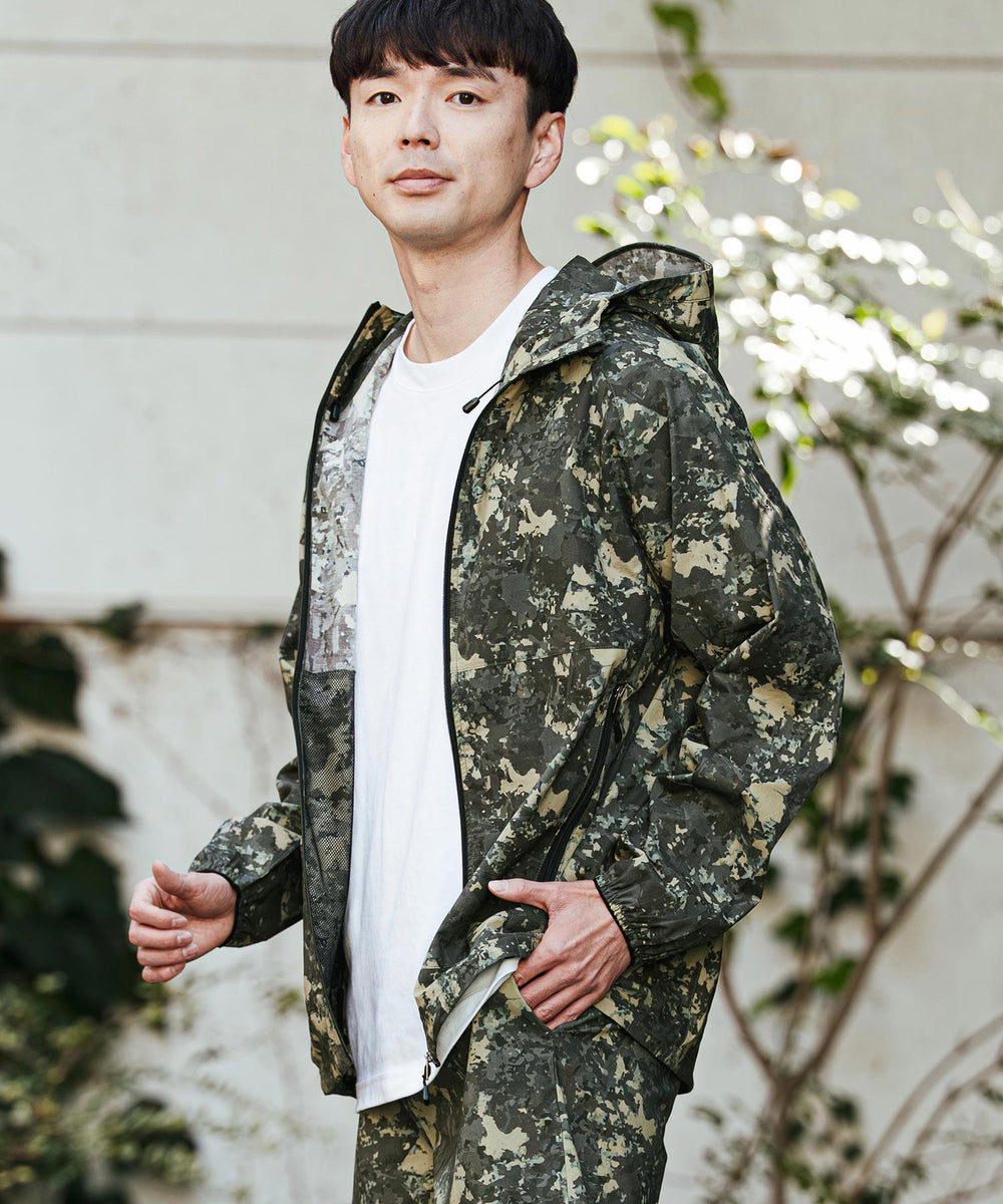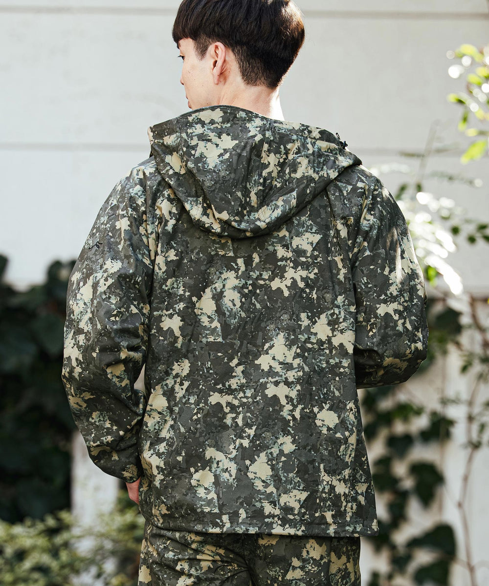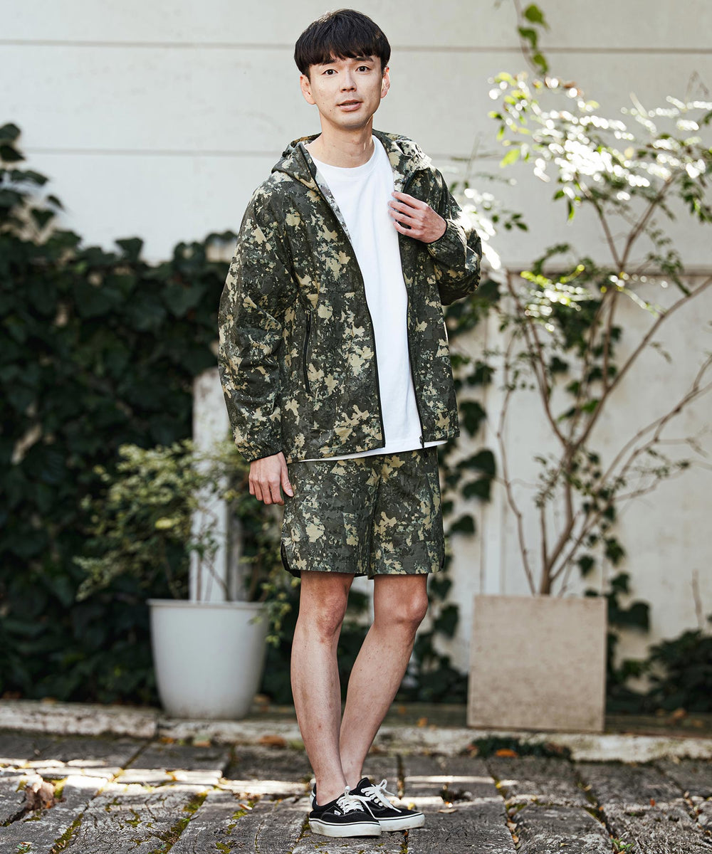 ブランドオリジナルのカモフラージュ柄をプリントした、デザインと機能性を兼ね備えた一着。アウトドアにも対応する耐久性と、タウンユースにも馴染む利便性を両立しました。