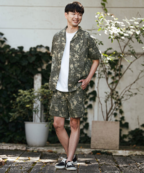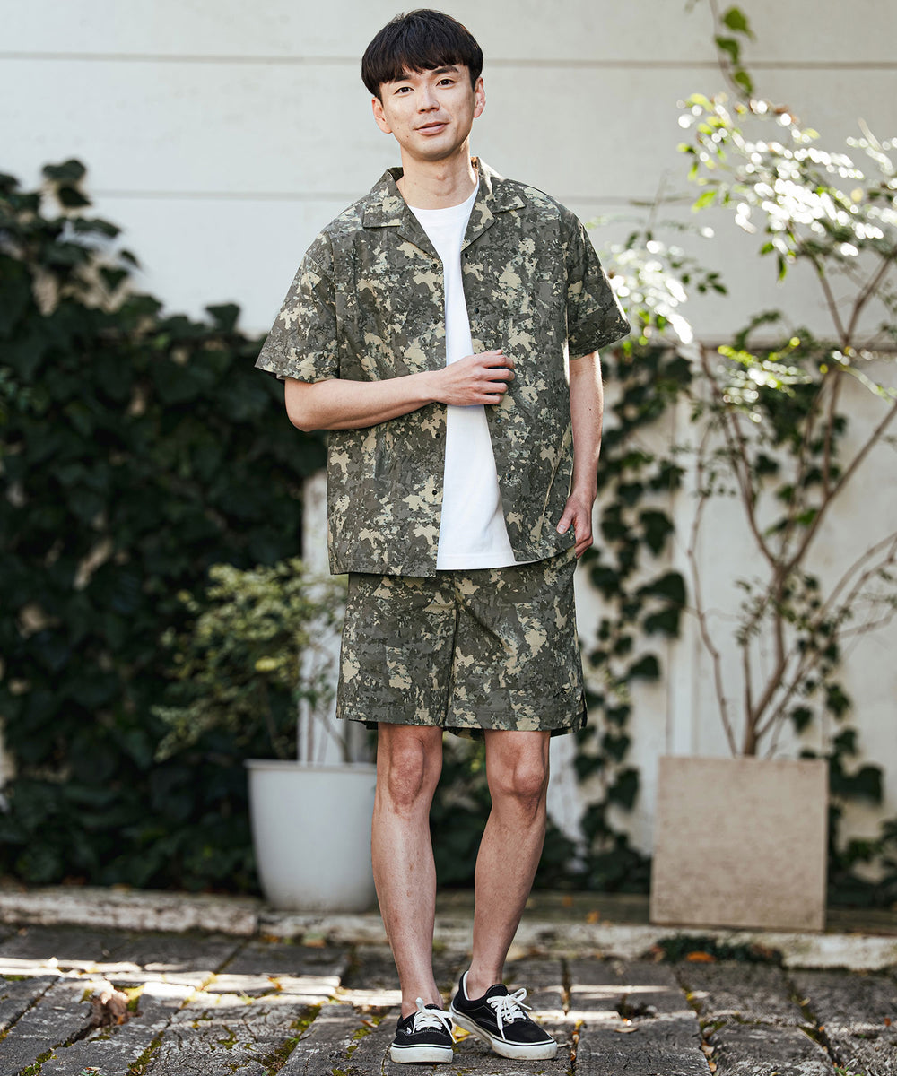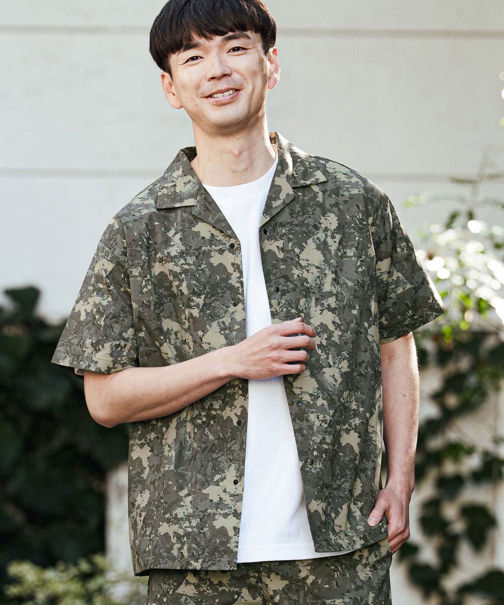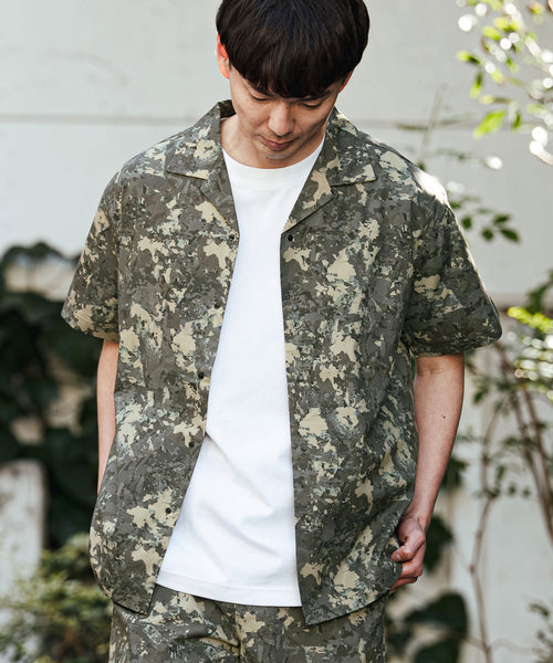 ブランドオリジナルのカモフラージュ柄をプリントした、存在感のある開襟シャツ。耐久性の高いダンプ素材を使用し、アウトドアからタウンユースまで幅広く対応します。