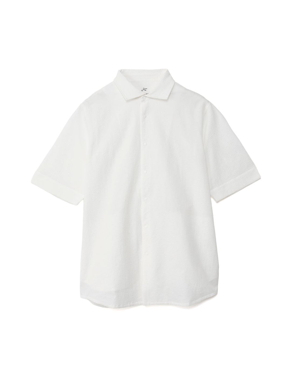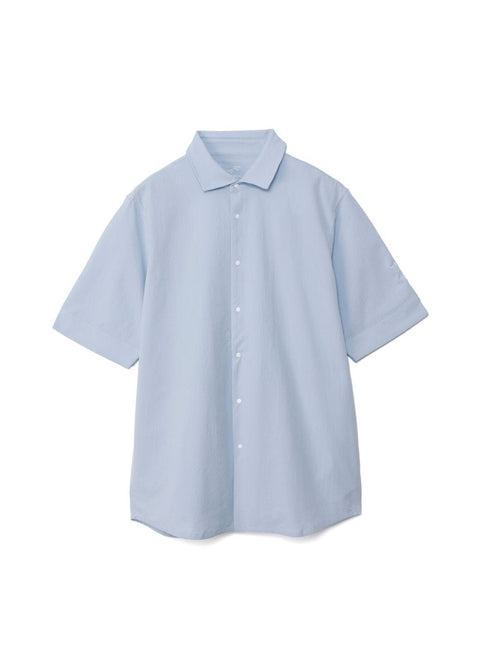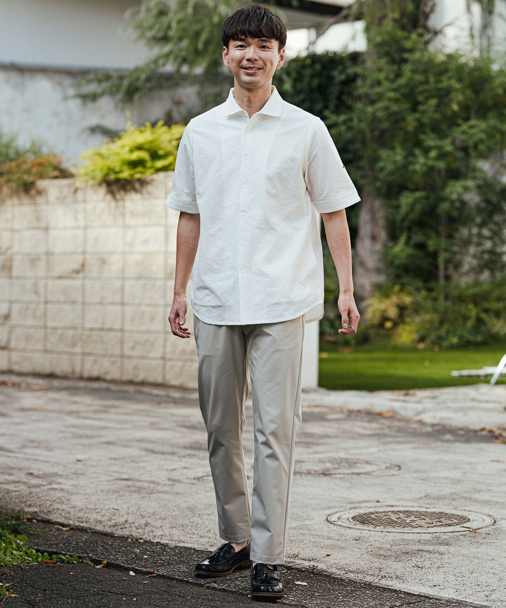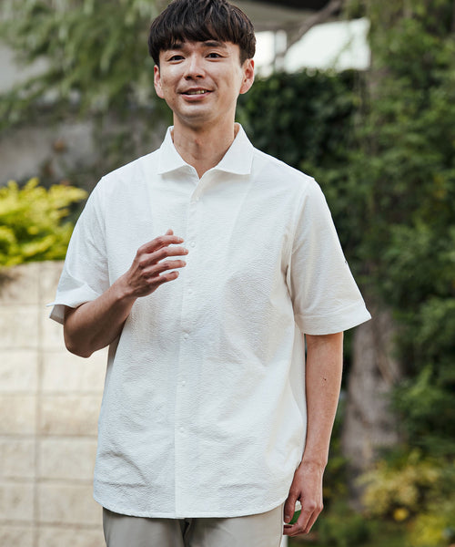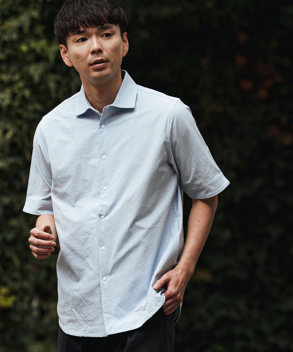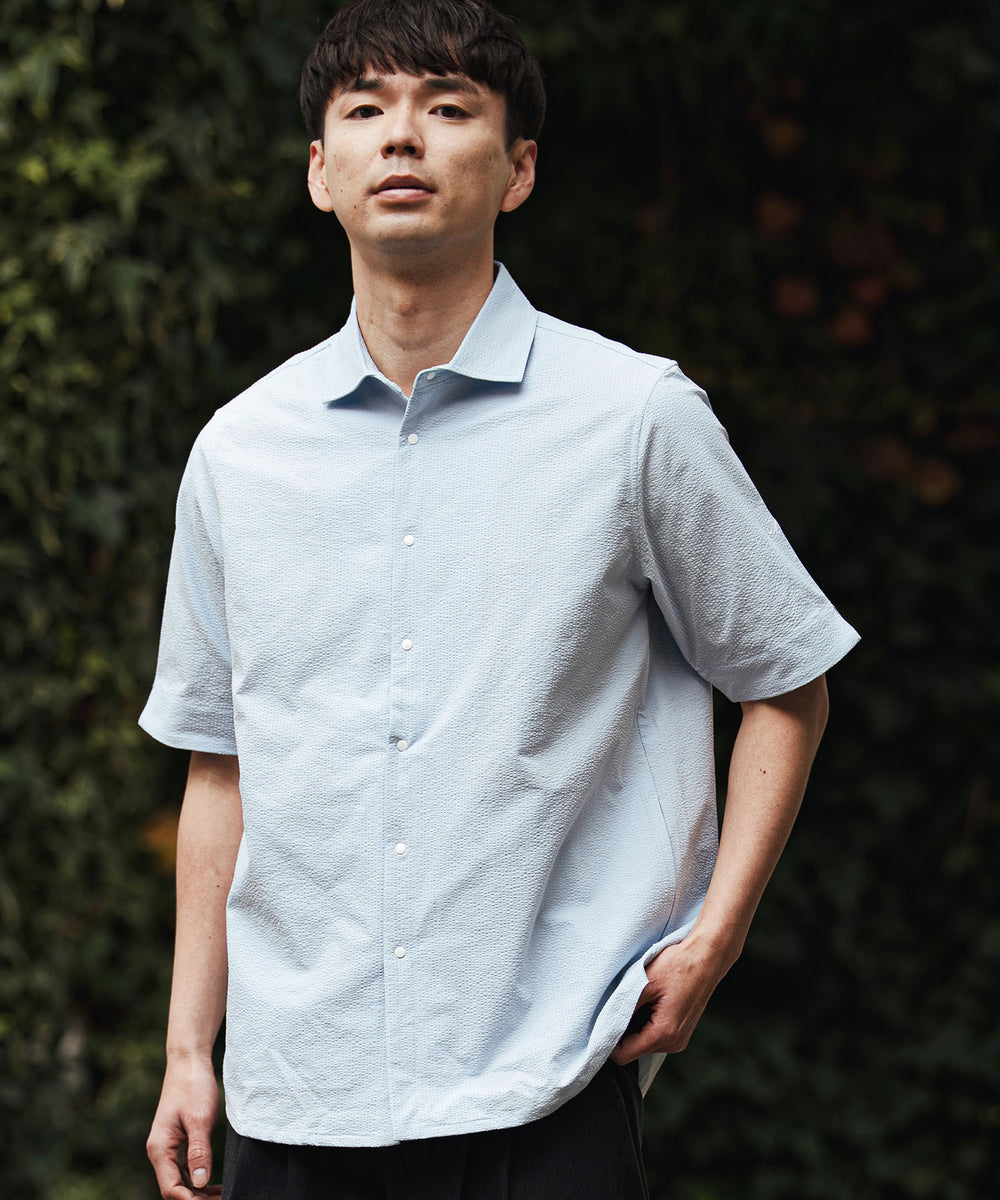 凹凸のあるシアサッカー生地が肌への貼り付きを防ぎ、風を通します。ホリゾンタルカラーで首元も涼しく、見た目にも清涼感のある一着です。