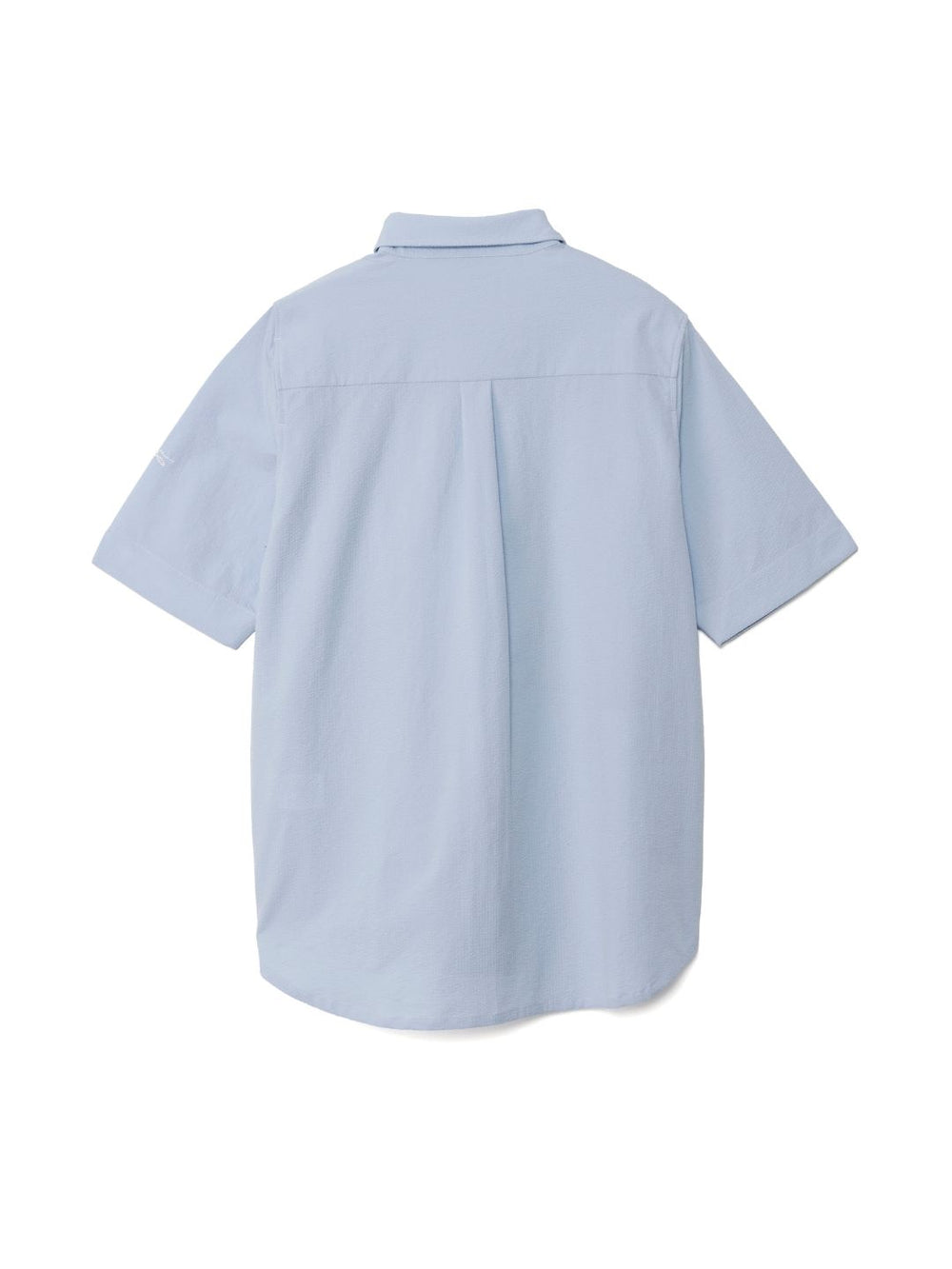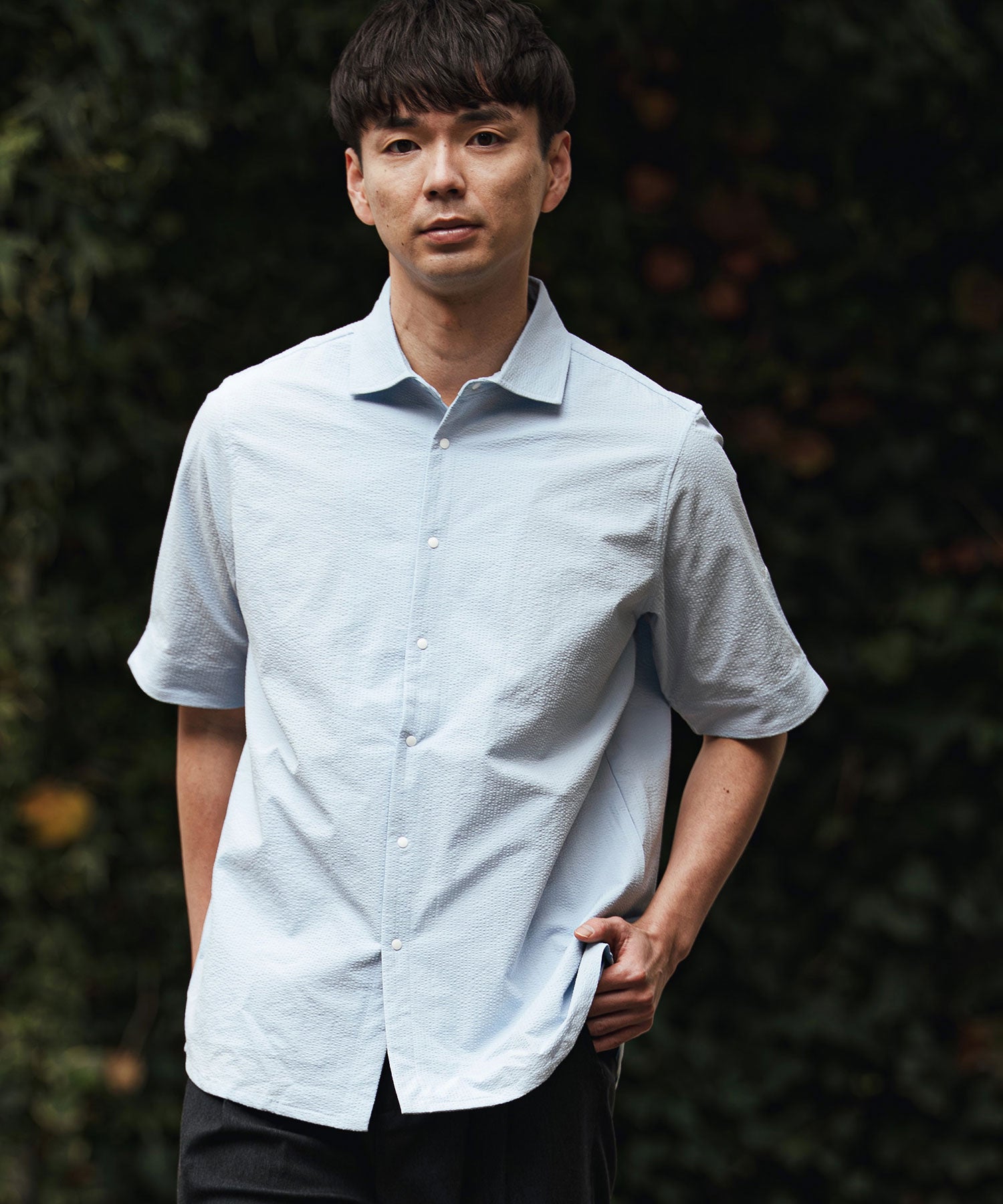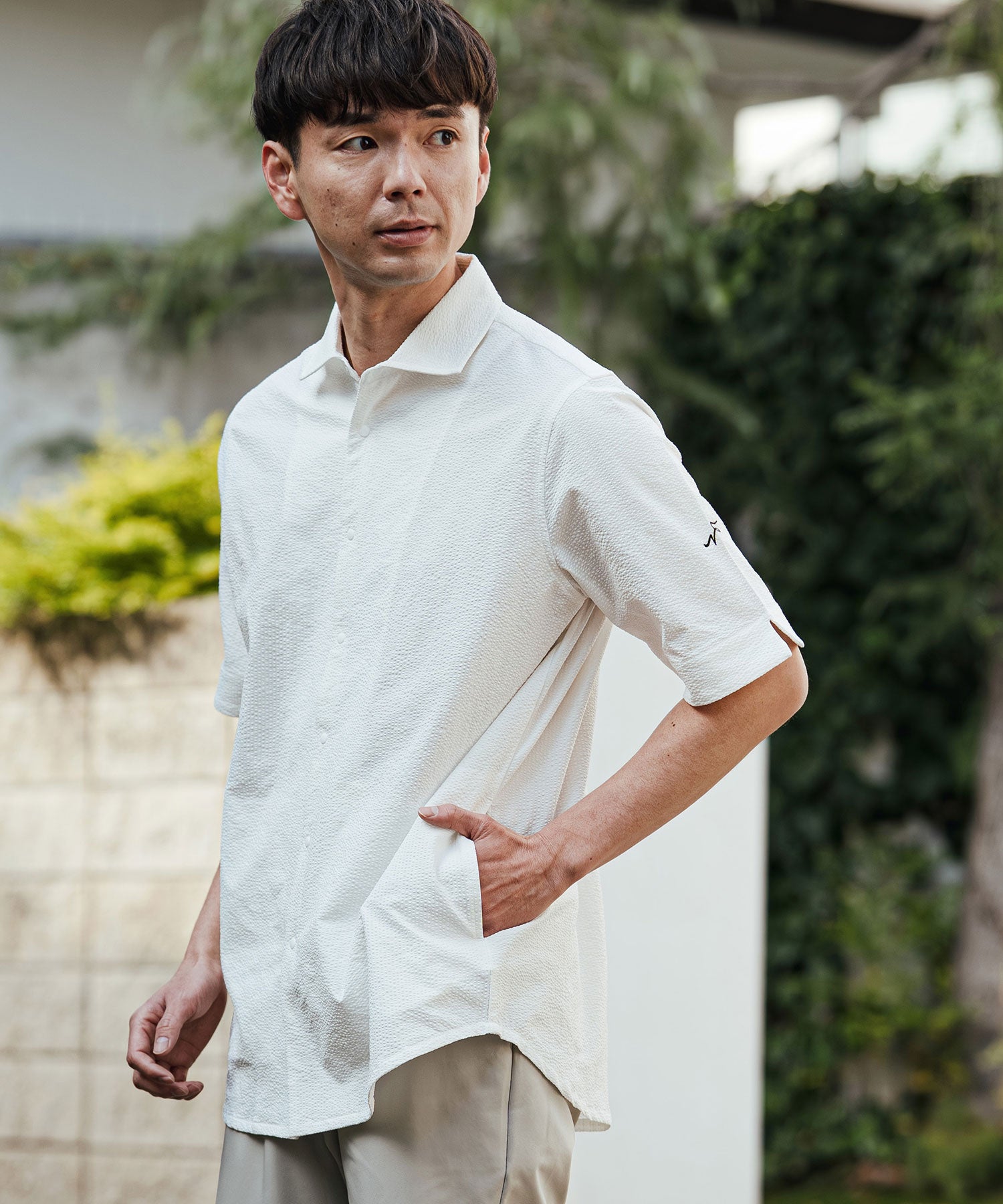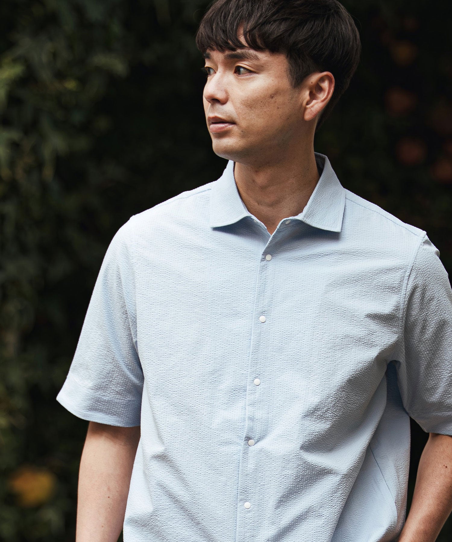 凹凸のあるシアサッカー生地が肌への貼り付きを防ぎ、風を通します。ホリゾンタルカラーで首元も涼しく、見た目にも清涼感のある一着です。