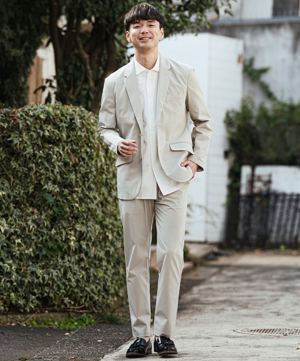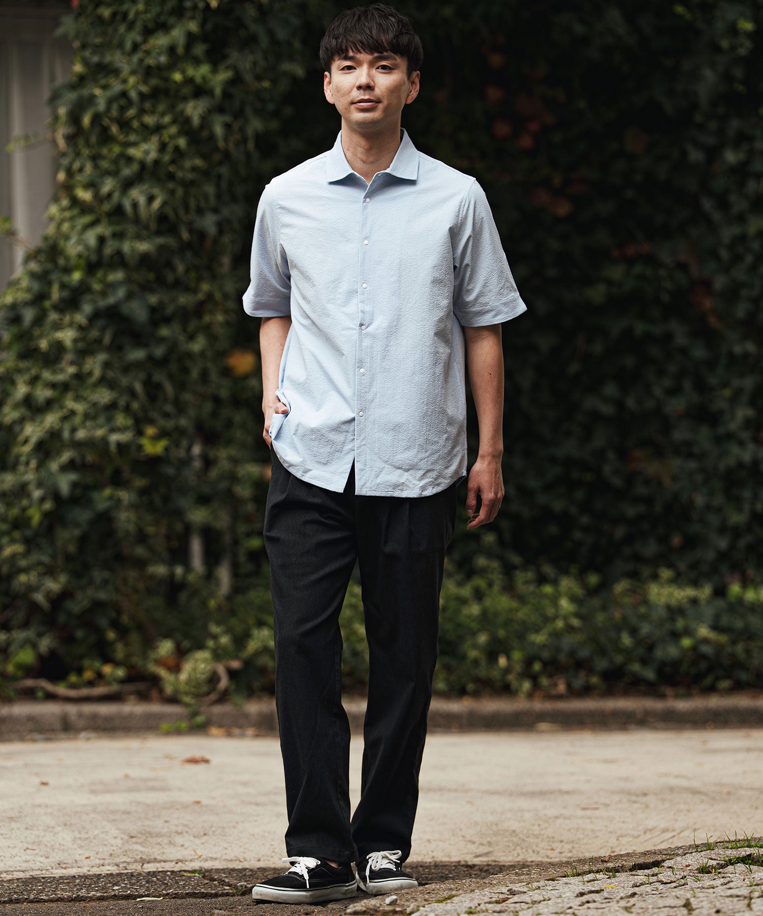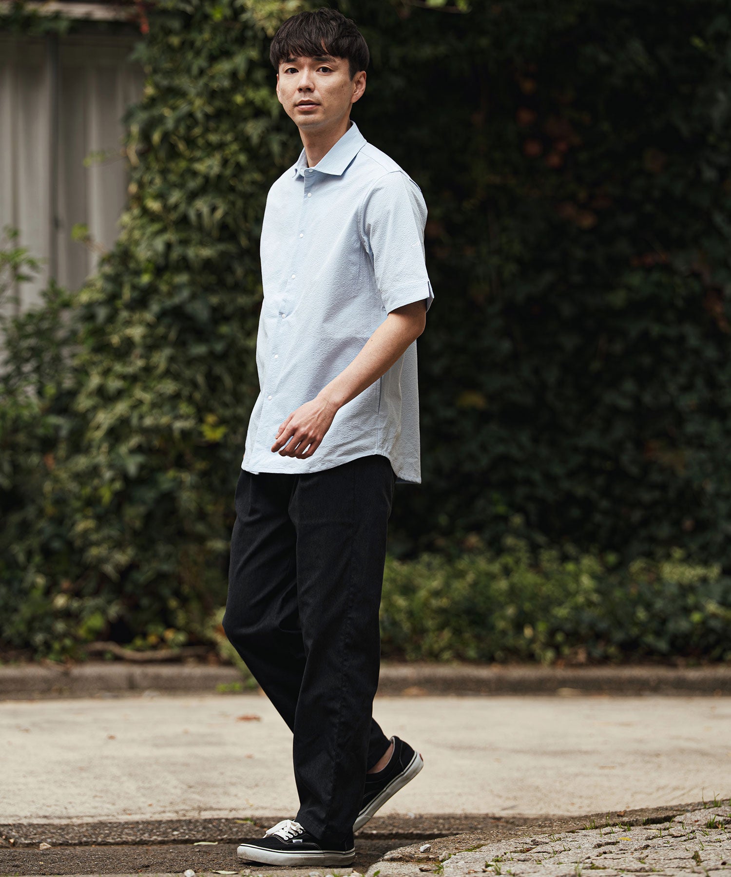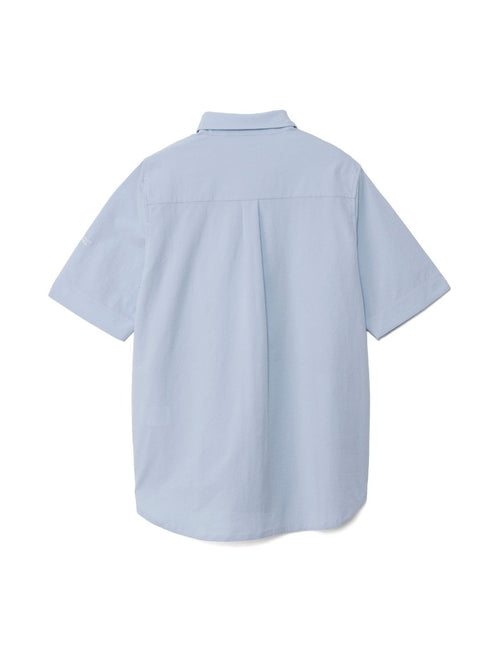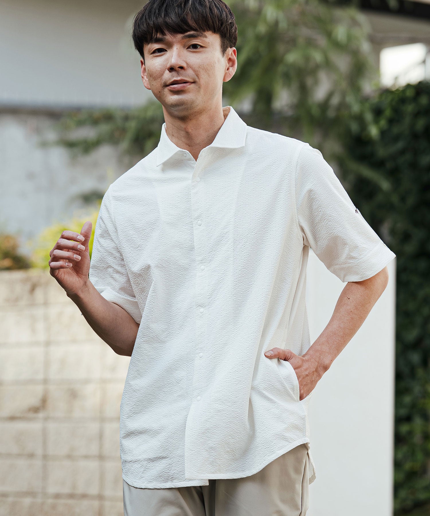 凹凸のあるシアサッカー生地が肌への貼り付きを防ぎ、風を通します。ホリゾンタルカラーで首元も涼しく、見た目にも清涼感のある一着です。