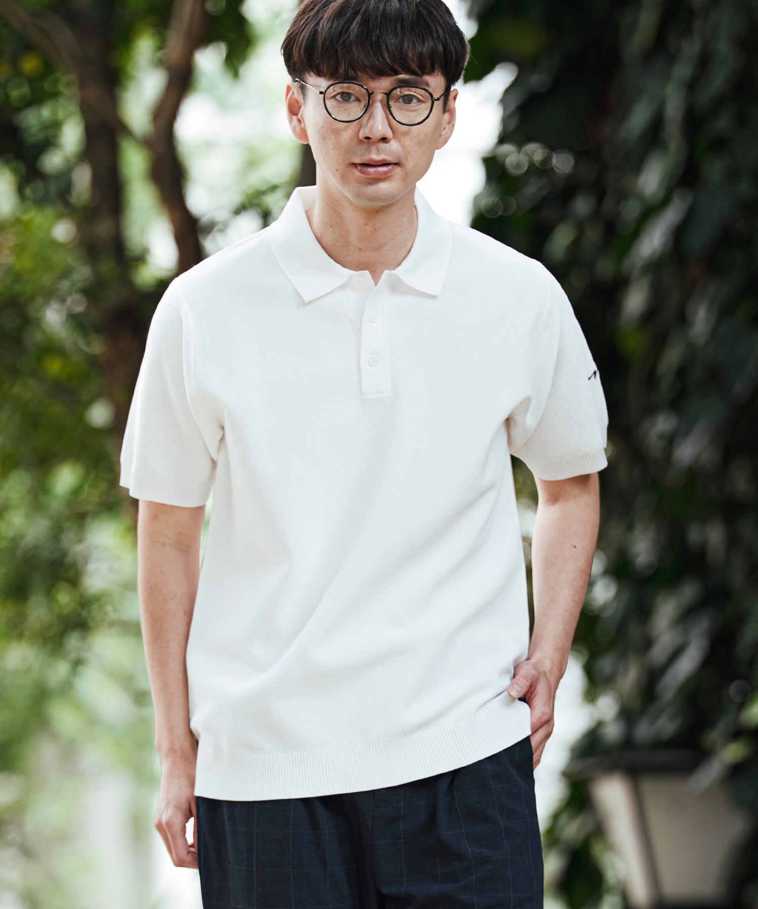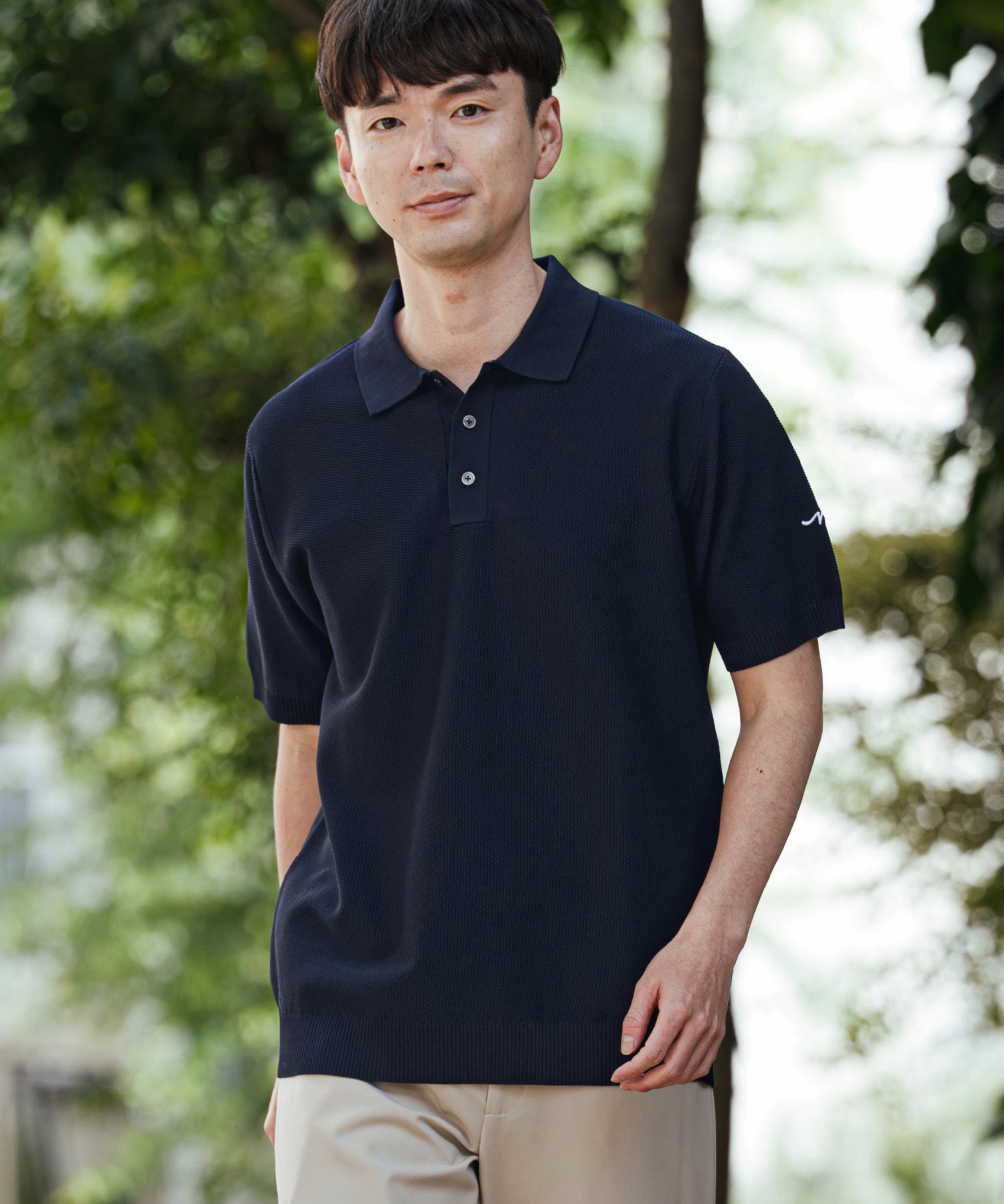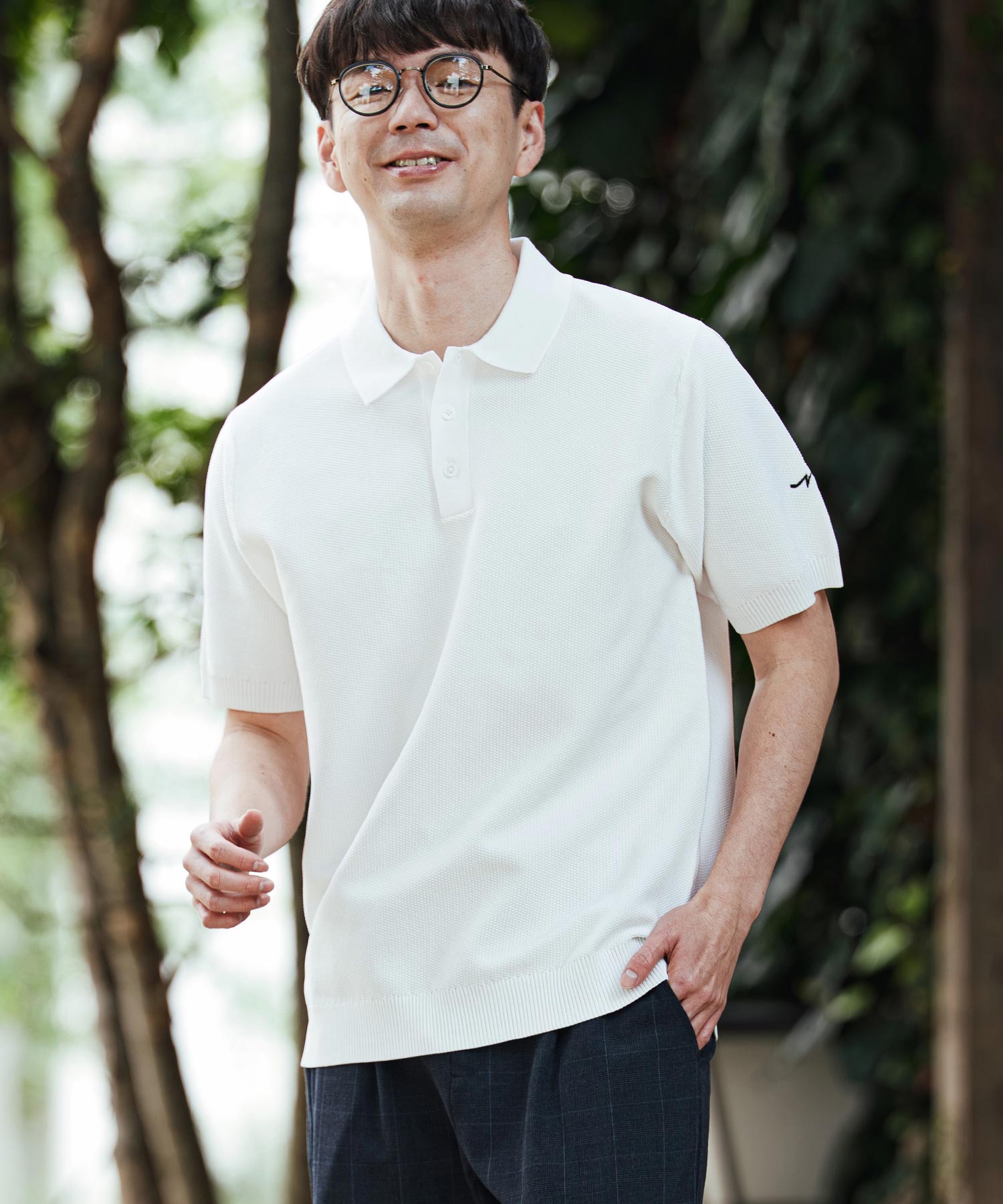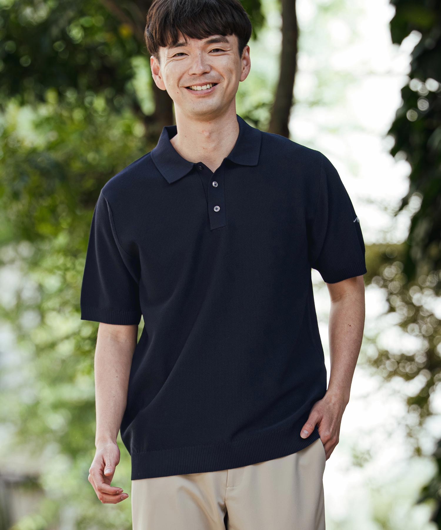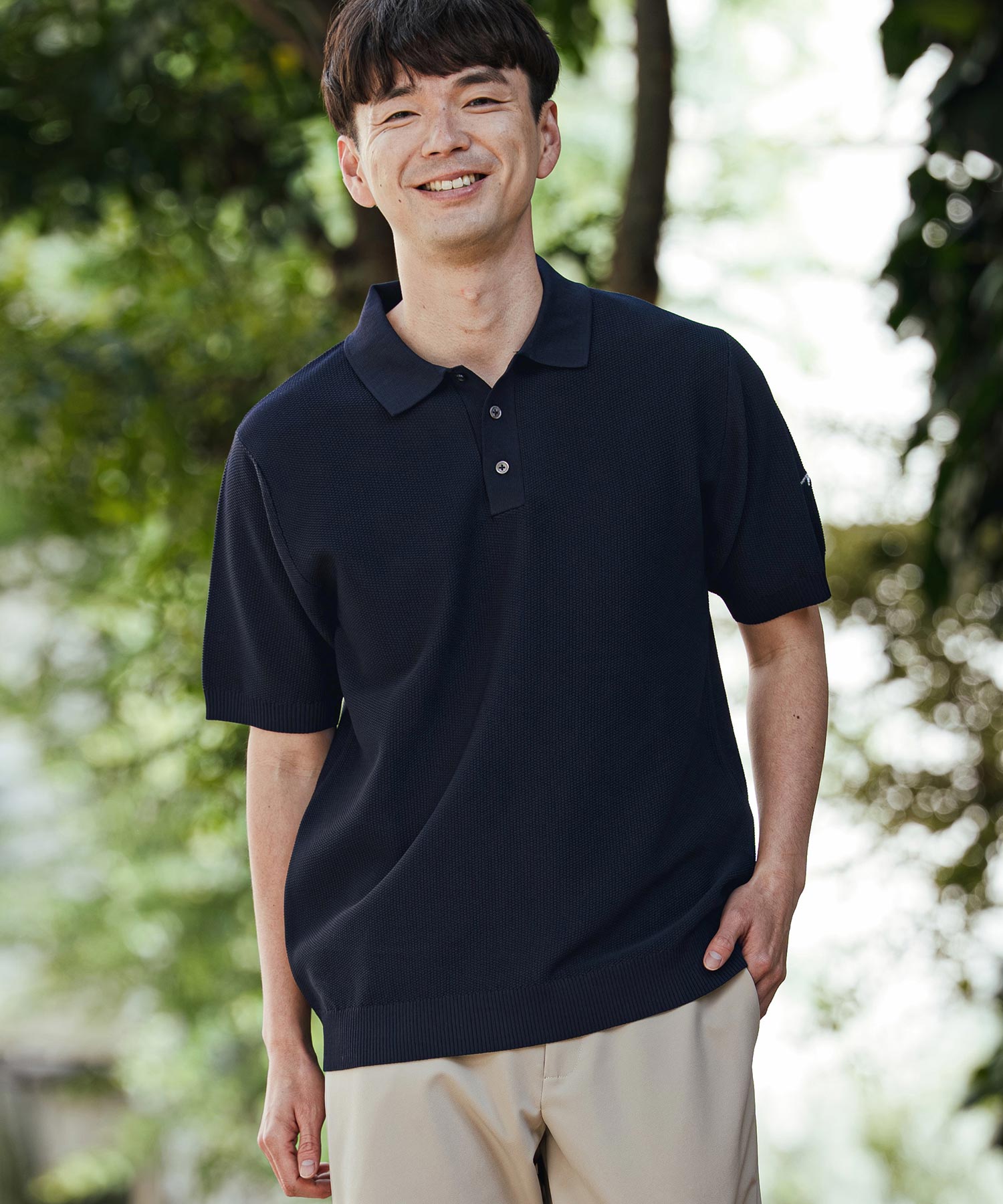 立体感のある鹿子編みが上品な印象を与える半袖ニットポロです。通気性と伸縮性に優れ、コンパクトなシルエットでスマートに着こなせます。
