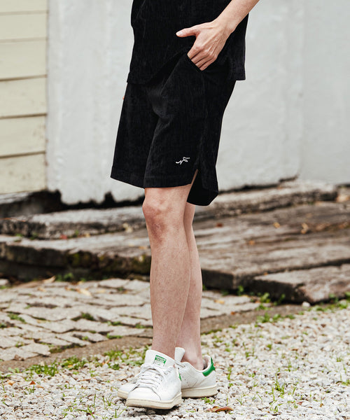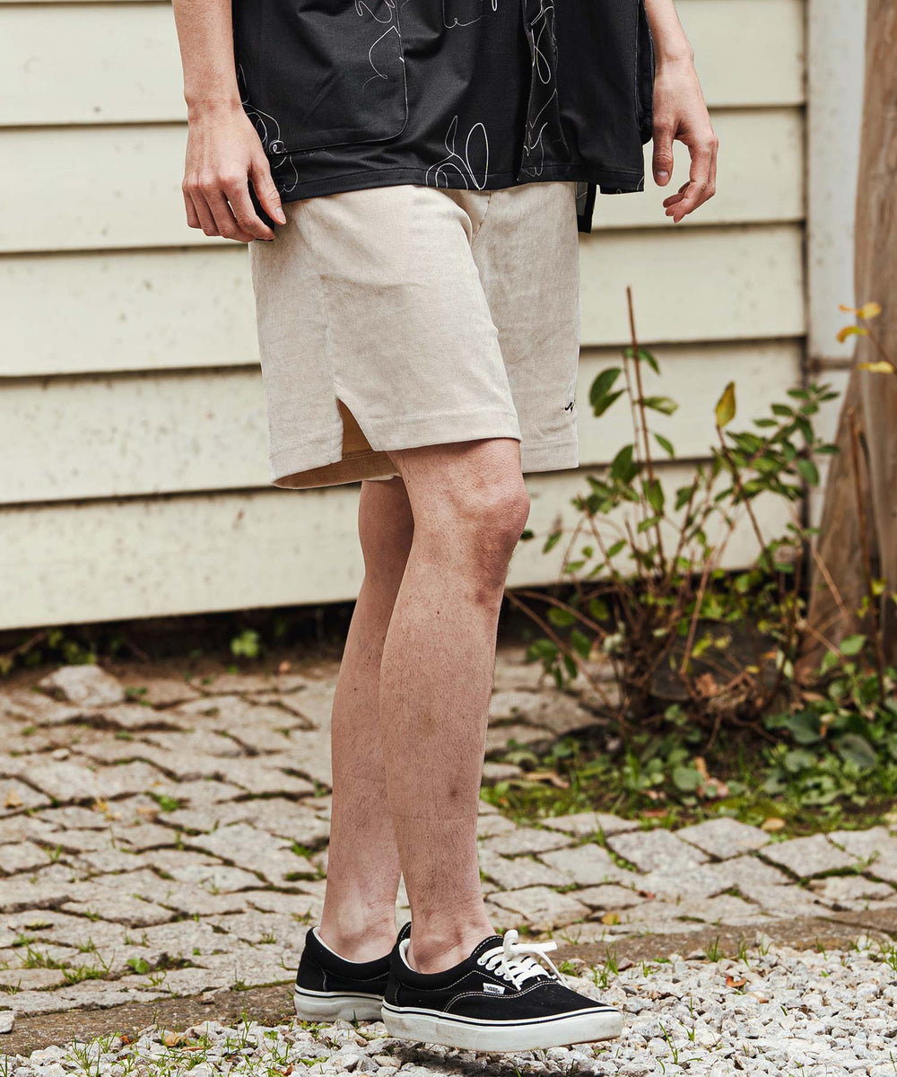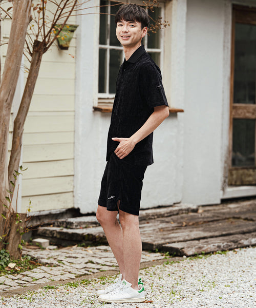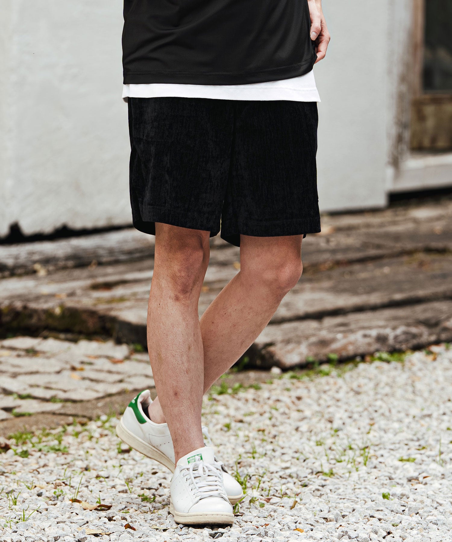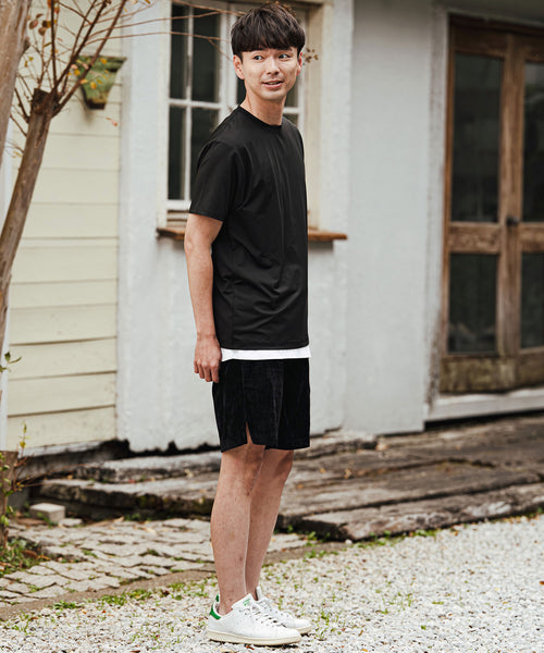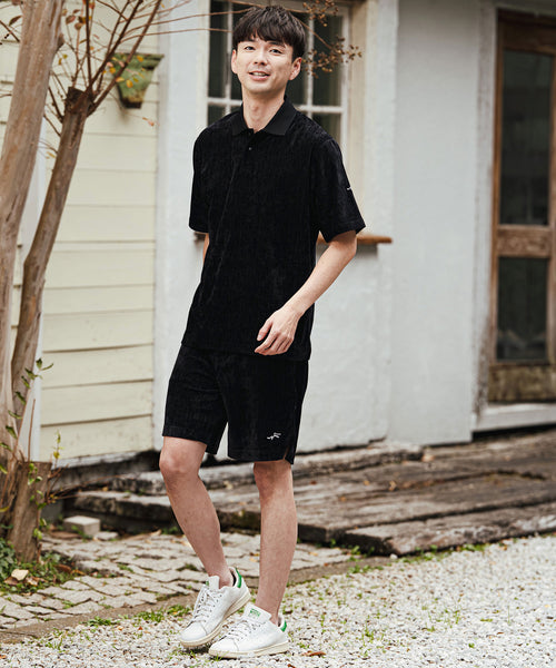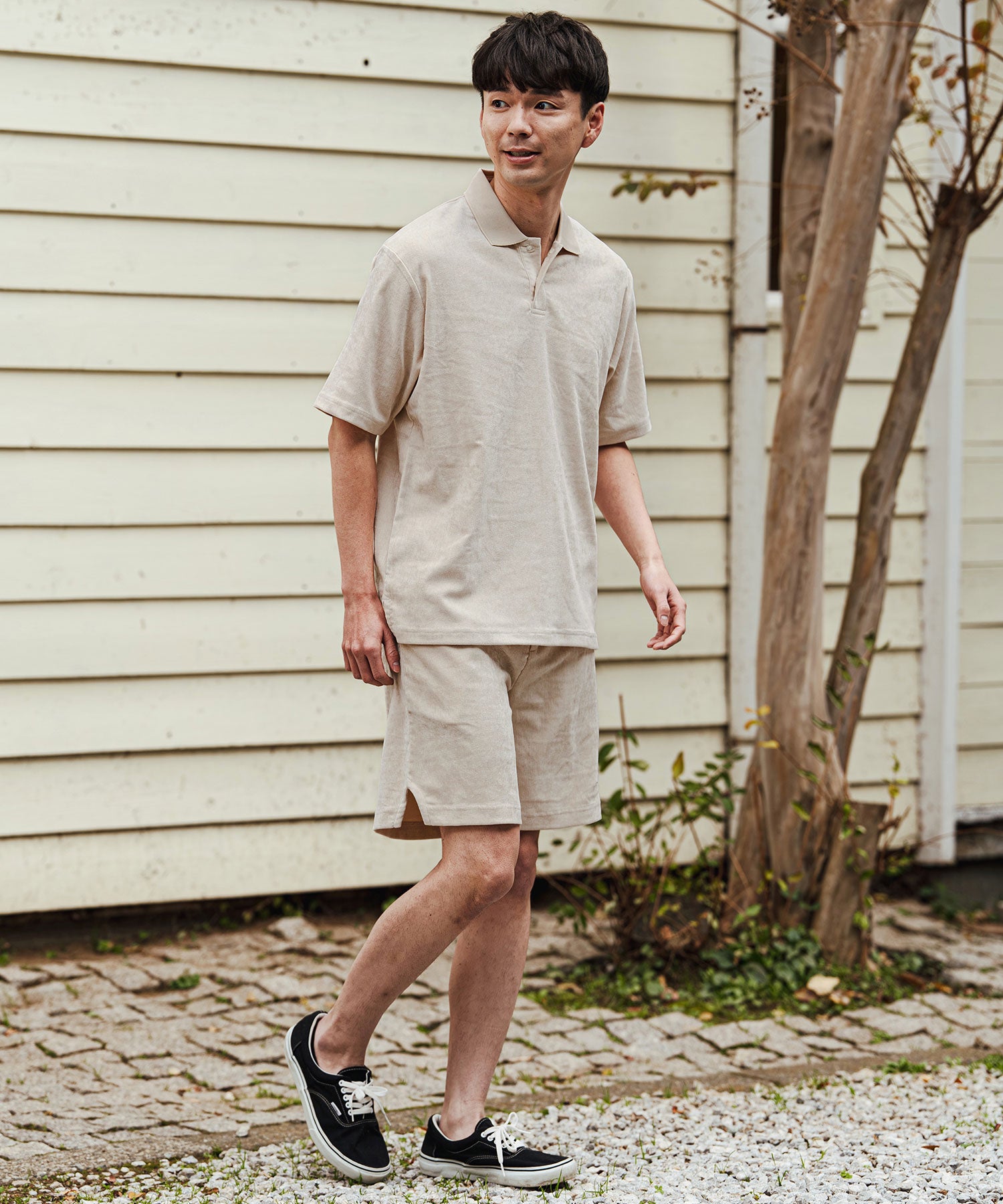 同素材のポロシャツと合わせたセットアップがおすすめ。シンプルなTシャツと合わせても素材感で差がつきます。
